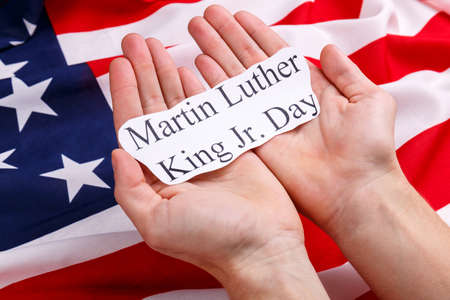 Hands of a European man holding a sign on the palms with the inscription Martin Luther King Jr. Day. Against the background of the American flag. Close-up.