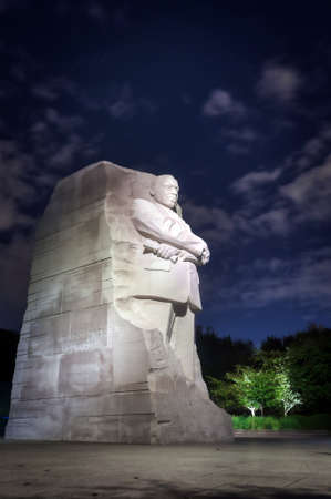 The Martin Luther King Jr. Memorial at dusk with deep blue sky, a monument to civil rights leader. Located in Washington, D.C., the memorial is the 395th National Park, and is located on the National Mall on the Tidal Basin.
