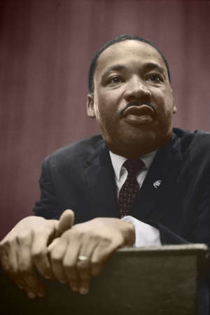Hand-colouring of Martin Luther King Jr, USA press conference 1964. Photograph manually colourized. Color image of African American minister and activist, lead the civil rights movement for people of