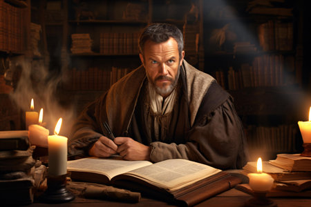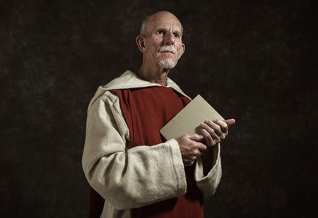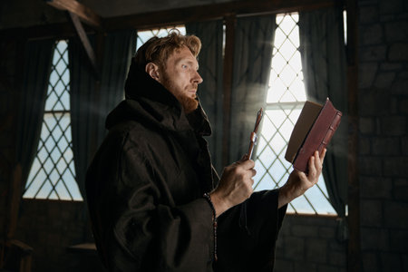 medieval monk with bowed head writing manuscript on parchment isolated on black
