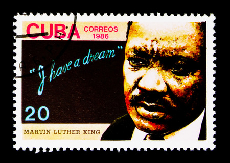 MOSCOW, RUSSIA - NOVEMBER 25, 2017: A stamp printed in Cuba shows portrait of Martin Luther King, serie, circa 1986