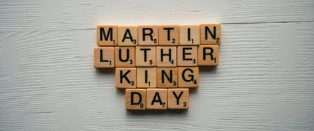 The image features wooden Scrabble tiles arranged to spell out MARTIN LUTHER KING DAY against a soft, textured white background. This creative display highlights the significance of the holiday, evoking feelings of reflection, honor, and unity in celebrating the legacy of a great leader.