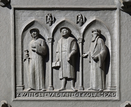 Fathers of the Reformed Churches of Switzerland: Zwingli, Vadian, Oecolampadius, relief on the door of the Grossmunster church in Zurich, Switzerland