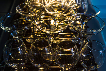 Stack of empty champagne glasses on the table in restaurant. Selective focus.