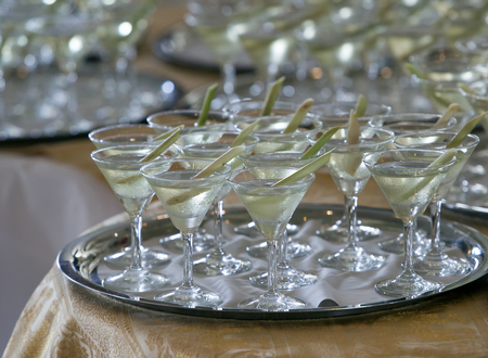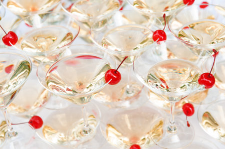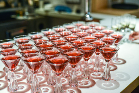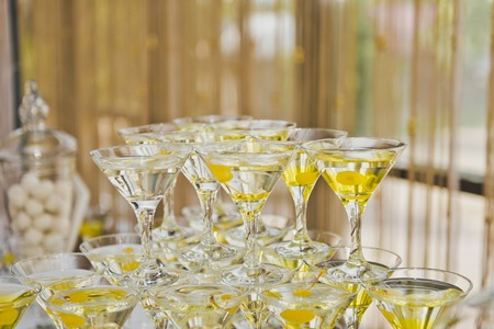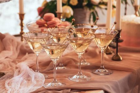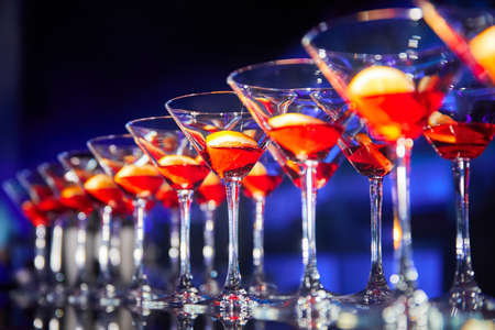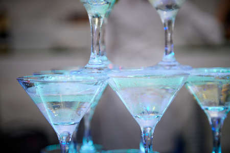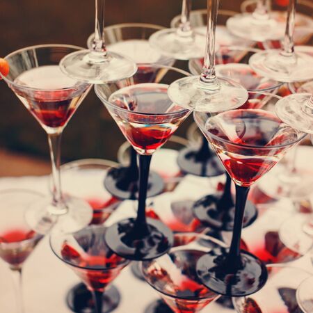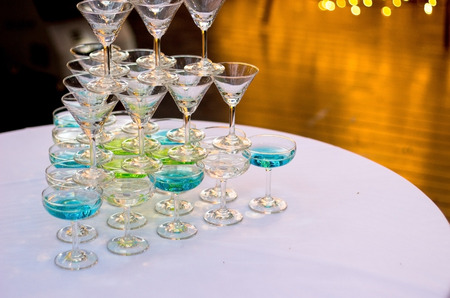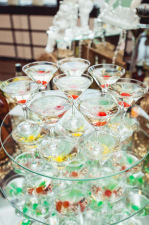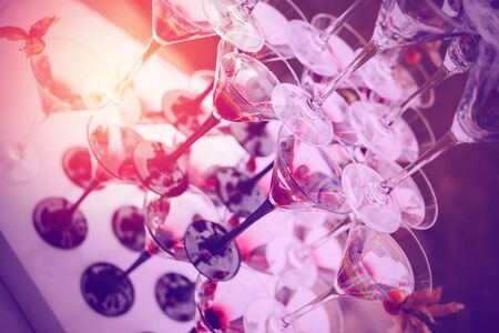 Abstract Background of Champagne Glasses with Color Cocktails. Wedding Reception. Selective Focus.