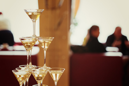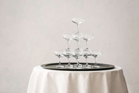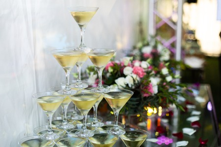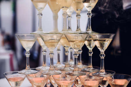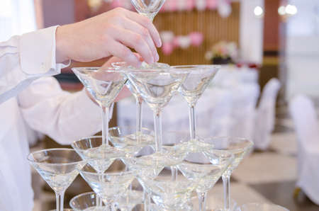 Pyramid holiday of champagne glasses on table in wedding party. Service.