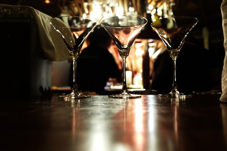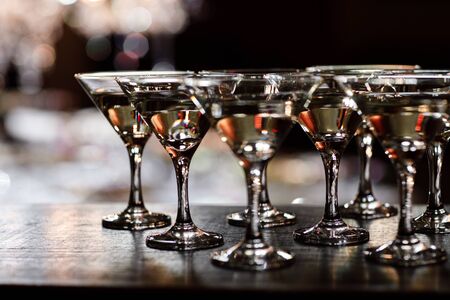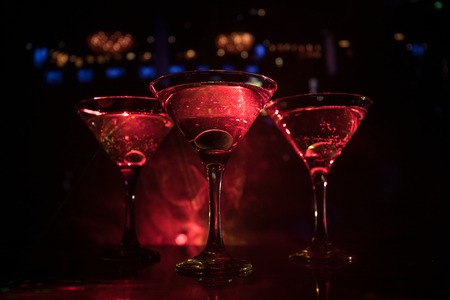 Several glasses of famous cocktail Martini, shot at a bar with dark toned foggy background and disco lights. Club drink concept. Selective focus