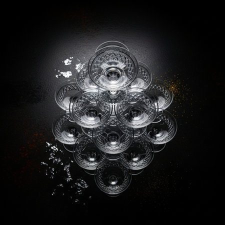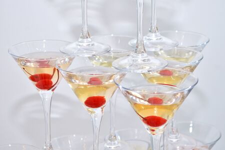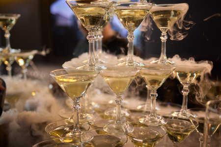 Triangular martini glasses, filled with champagne with cherries and liquid nitrogen, creating steam, built in the shape of a pyramid