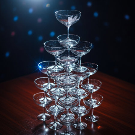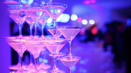 Stacked glasses create an elegant display at a celebration. The vibrant purple lighting adds a sophisticated touch to enhance the party atmosphere.
