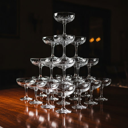 Celebration. Pyramid of champagne glasses. Gently toned.