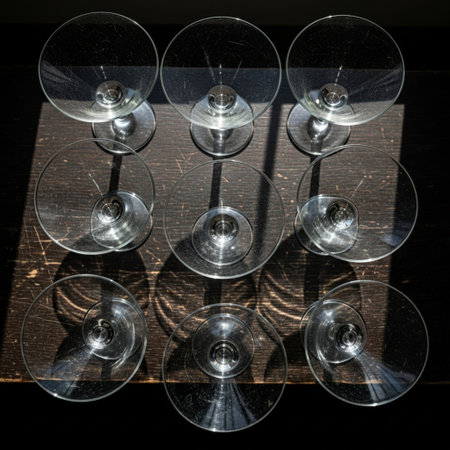 A top-down view of seven empty, dusty martini glasses aligned on a dark wooden shelf with harsh sunl
