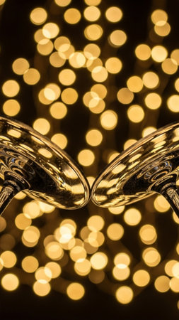 A striking vertical, 9:16 portrait of two empty champagne flutes gently touching, shot with a cinema