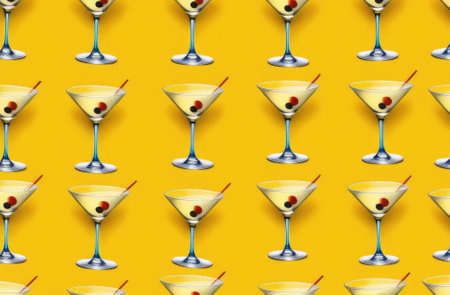 illustrated pattern of summer cocktails with alcohol on yellow background, refreshing delicious sip.