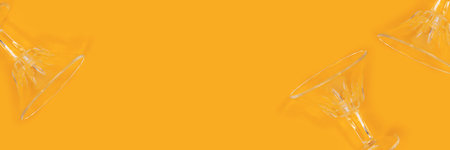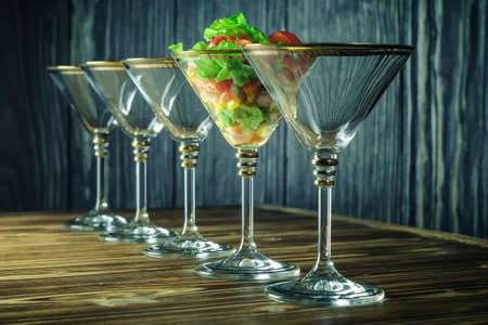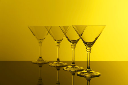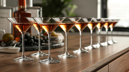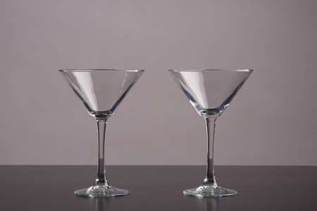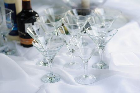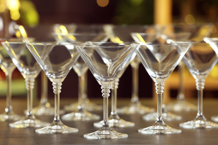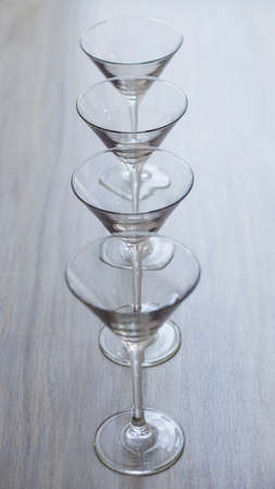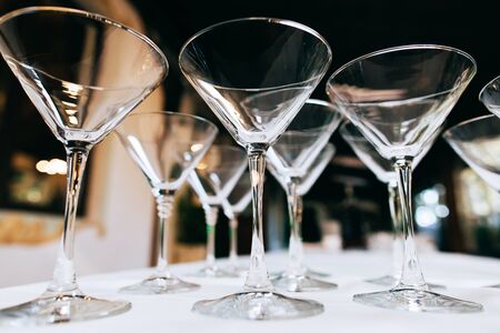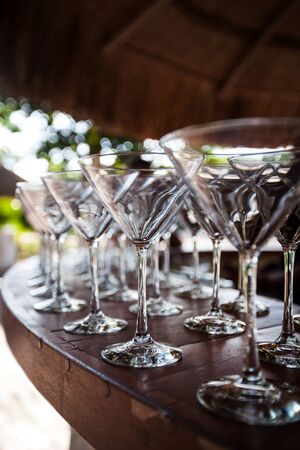 Empty Martini glasses setting in row, outside on wooden bar counter at tropical grass palapa, ready for celebration party, selective focus