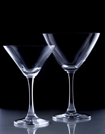 Couple of cocktail glasses with martini drink with ice on trendy black background with heart-shaped bokeh lights. Evening or night date concept.