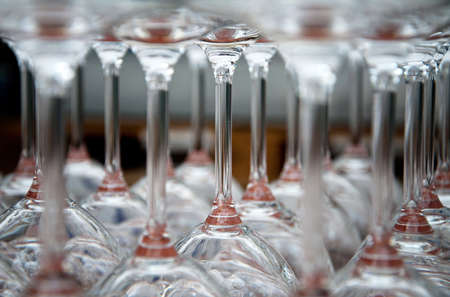 Empty clean crystal wine glasses inverted on the table. Reflections in the glass.