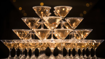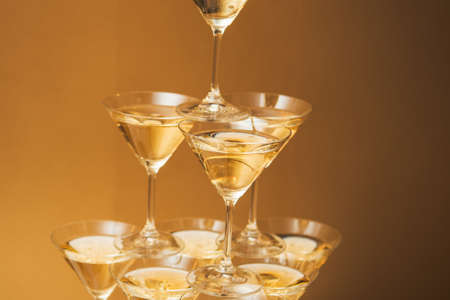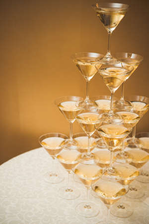 Pyramid of glasses of champagne. Drinks at the party. Golden colors.
