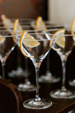 A row of glasses with alcoholic drink and orange slices on the bar counter in the process of preparing alcoholic cocktails. Close up, selective focus