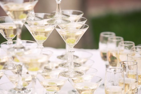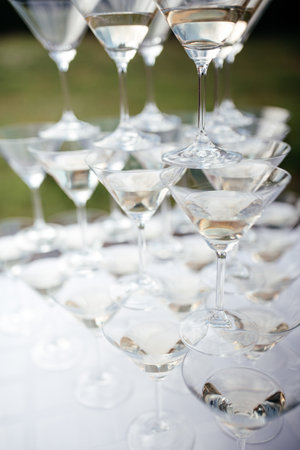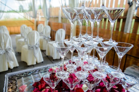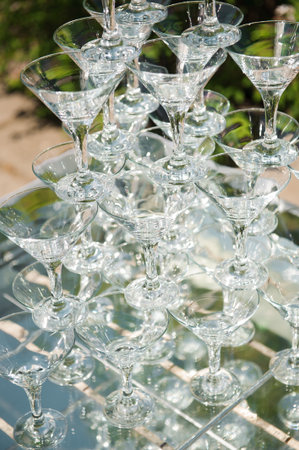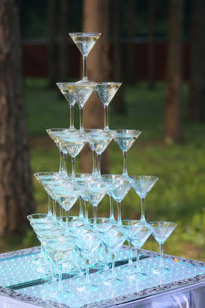 Pyramid glasses. Mount champagne on the table nature, wedding, catering