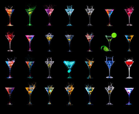 Martini cocktail glass splashing on dark toned smoky background or colorful cocktail in glass with splashes and lemon. Party club entertainment. Mixed light. Selective focus