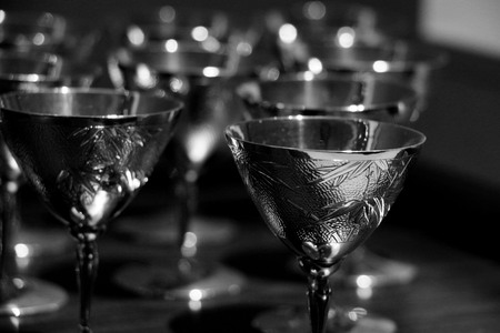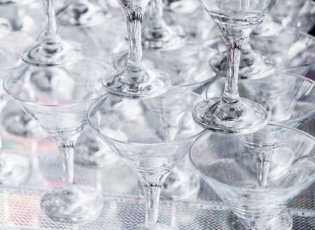 Pyramid of wine glasses on the table in a restaurant. Close-up