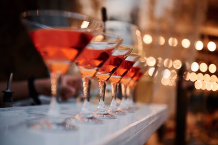 Beautiful row line of different colored alcohol cocktails on a party, martini, vodka,and others on decorated catering bouquet table on open air event, picture with beautiful bokeh