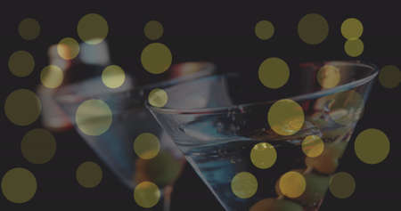 Image of glowing yellow lights over cocktail glasses. party and celebration concept digitally generated image.