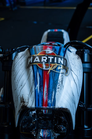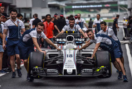 KUALA LUMPUR, MALAYSIA - SEPTEMBER 28, 2017 : Team mechanics work on William Martini Racing Lance Stroll racer car during Malaysia Formula One Grand Prix at Sepang Circuit.