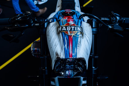 Verona, Italy : 2025 01 24 MBE Motor Bike Expo Custom Motorbike and Custom Muscle Car Event White Custom Motorcycle: Unique Design Martini racing. High quality photo