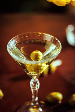 Intimate Cocktail Hour. Martini with Olives on a Wooden Table