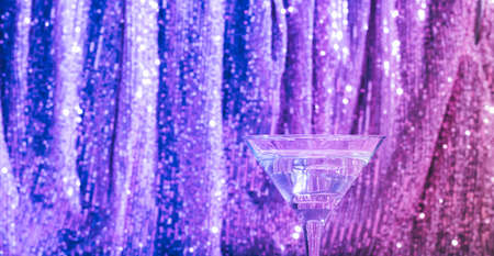 Martini cocktail on neon background of pink glittering curtain. Alcoholic classic drink with ice in an elegant glass