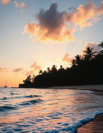 The shoreline features soft sand and gentle waves lapping at the beach. Lush palm trees line the coast, creating a serene atmosphere under a colorful sky.