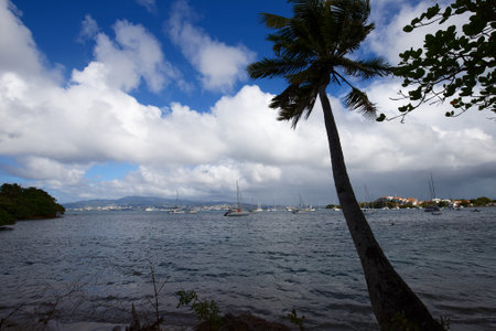 Wallilabou Bay, Saint Vincent and the Grenadines - December 19, 2018: View from the shore out to sea and coconut palm at Wallilabou Anchorage - Pirates of the Caribbean's Port Royale - Saint Vincent.
