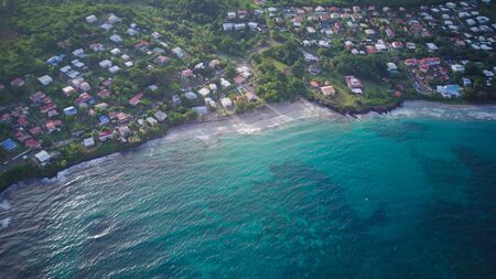 Guadeloupe beach drone sunset view. Plage Caraibe black beach aerial view in Pointe Noire.