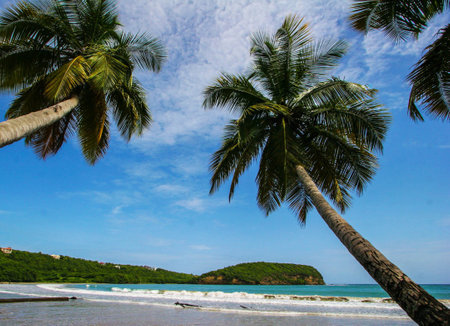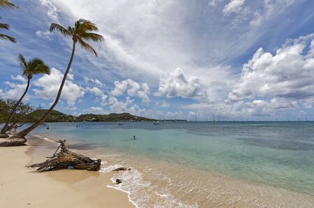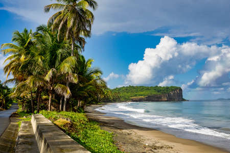 Caribbean Martinique Diamant beach with coconut palm and blue sky. Travel concept for beach vacatation. French oversea territory.