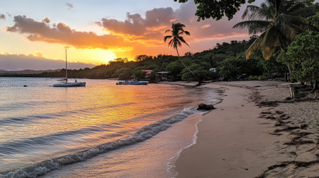 Sunset, paradise beach and palm trees, Martinique island.