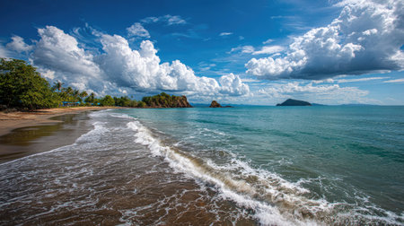 Discover a breathtaking tropical beach scene featuring gentle waves lapping against a sandy shore, dramatic clouds floating in a blue sky, and lush green trees.