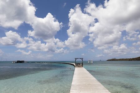 harbor port with jetty hotel passenger ferry and yacht sailboats Clifton Union Island St. Vincent and the Grenadines in Caribbean