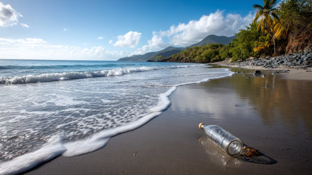 Used plastic water bottle washed up on the shore of a tropical beach, highlighting the worldwide crisis of plastic pollution on even the most remote islands.