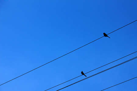 Birds sitting on electric wires on blue sky background