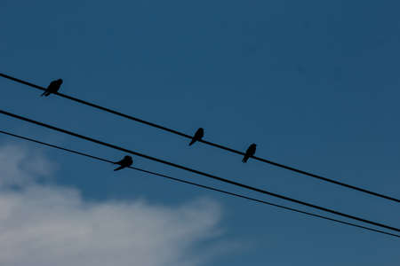 Many birds, swallows or martlets, swifts sit on wires against the background of the blue sky. Copy space. High quality photo