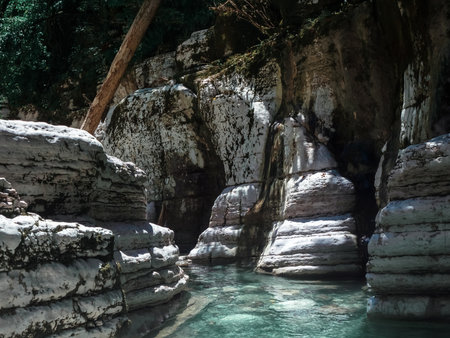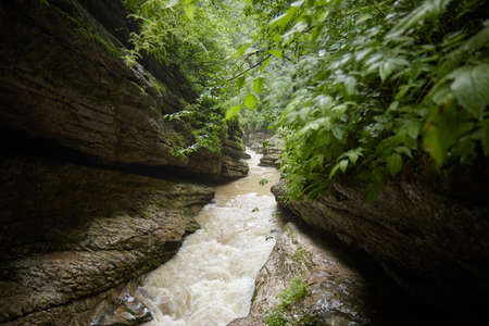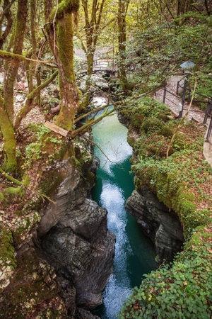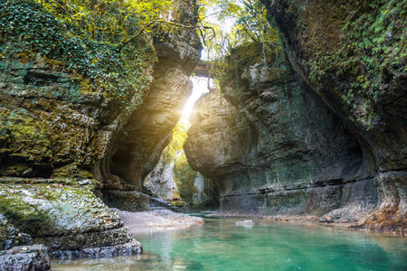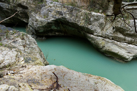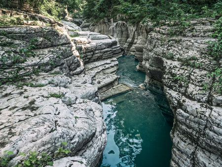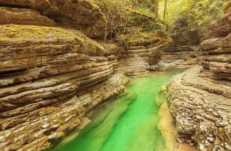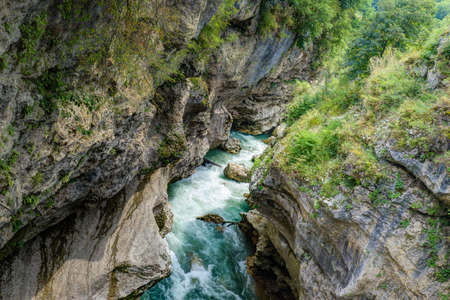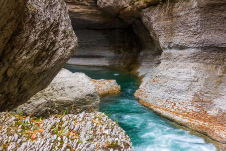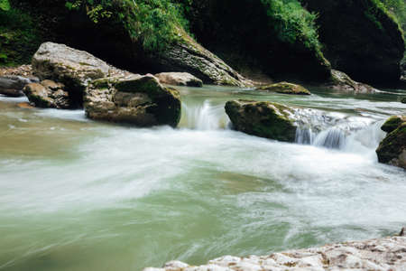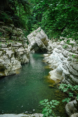 Gorge with a mountain river with a vibrant turquoise water between the rocks. Hadzhohskaya Tasnina Gorge Adygea Lago-Naki Kamennomostskiy