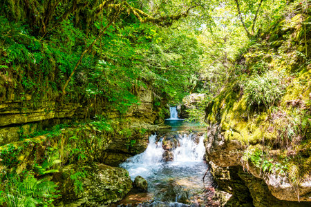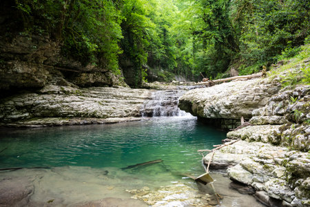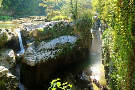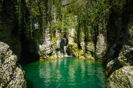 Waterfall in a green spring forest surrounded by stones, clear turquoise water on an impressive natural landscape. 33 Waterfalls, Sochi, Russia.