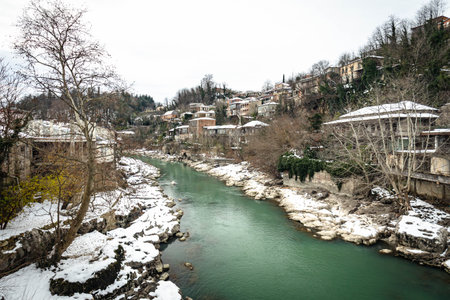 Winter cityscape of Kutaisi, Georgia with the Rioni River, traditional homes on the hillside, and snow along the rocky riverbanks. Peaceful and authentic seasonal travel view