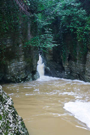 The Olginsky Waterfall in the Republic of Abkhazia. Cloudy day on May 21, 2021