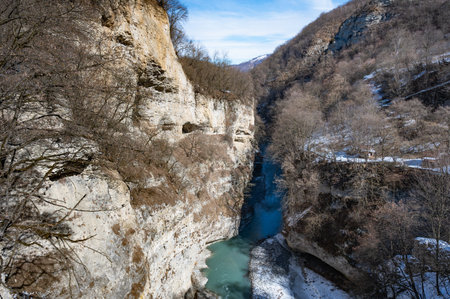 Argun Gorge featured with steep cliffs and a winding river, flanked by bare trees. Snow accents the rugged terrain, highlighting the natural beauty amidst the tranquil landscape.