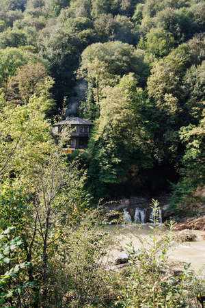Amazing forest waterfall flowing into the cold mountain river with large stones in autumn season in Georgia. Martvili canyon. Okatse canyon