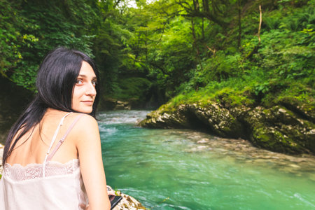 Female tourist woman look straight to camera with martvili canyon flowing river in background