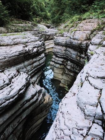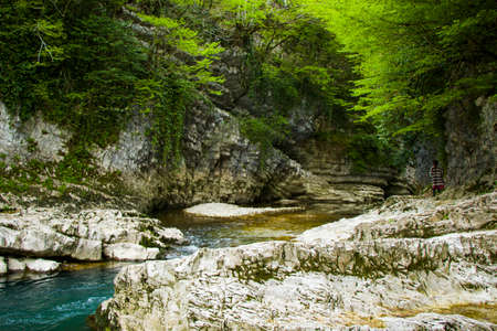 White Rock Canyon. winding gorge with clear blue water. The Khosta River flows along the cliffs Sochi. Beautiful wild tourist route