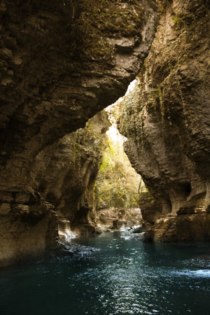 Martvili Canyon in Georgia. Natural canyon on Abasha river in Caucasus. Turquoise clear water of mountain river flowing between steep cliffs